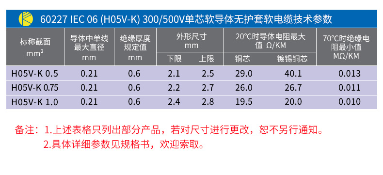类型/电缆结构单芯软线RV/H05V-K